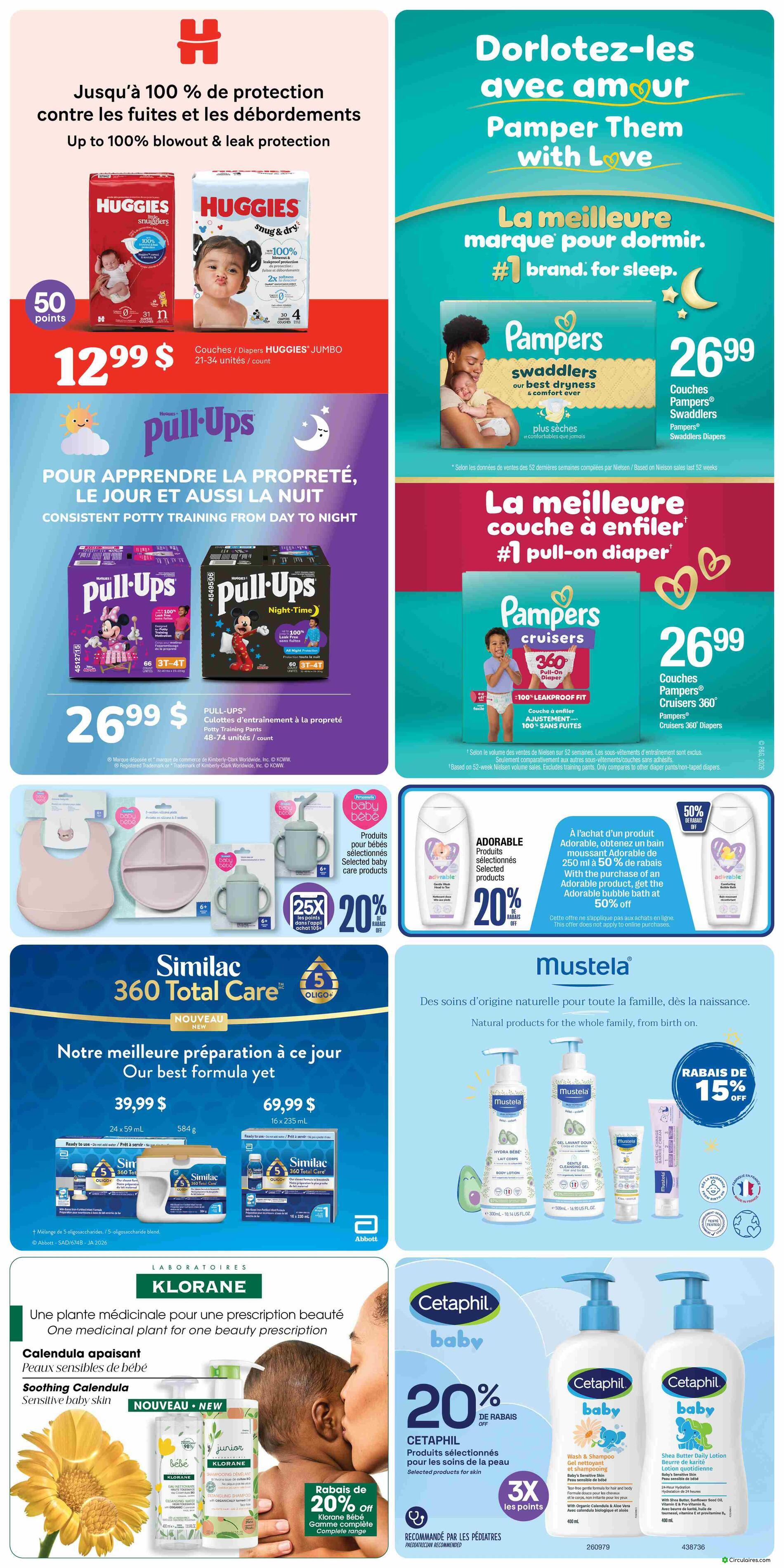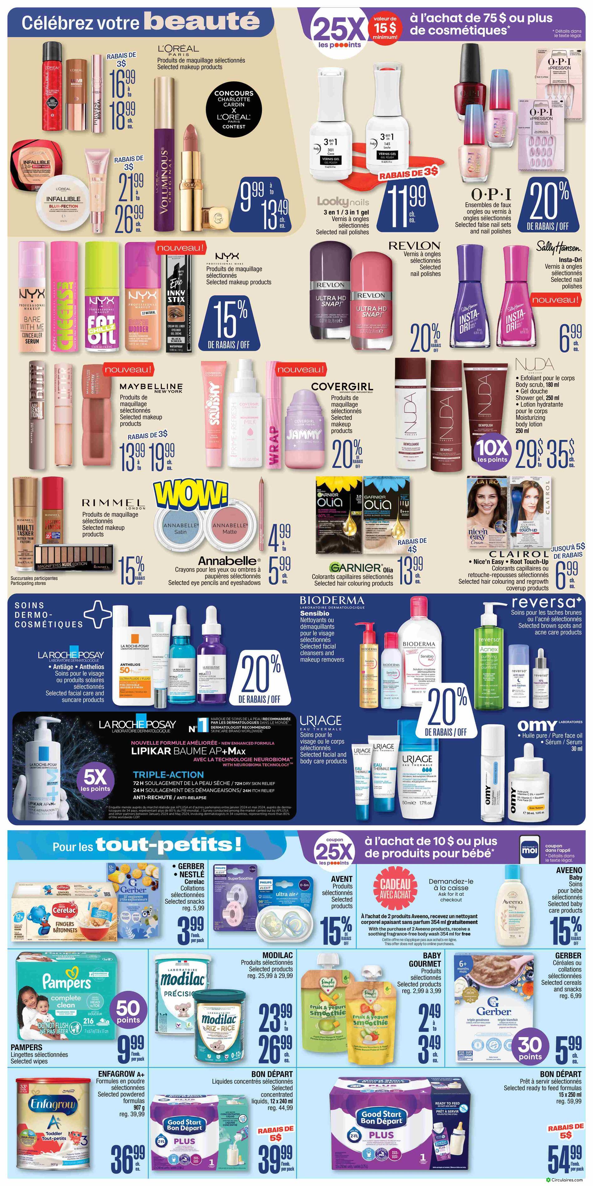 La circulaire affiche chaque semaine une liste de produits essentiels en promotion. Les rabais touchent souvent des marques populaires comme OLAY, PERSONNELLE et CETAPHIL.